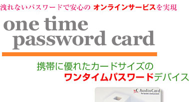 弊社のワンタイムパスワードカードは携帯性に優れたカードサイズの使い捨てパスワード生成デバイスです。パスワードを数字で表示する『ディスプレイタイプ』と音で発生するユニークな『サウンドタイプ』の2種類のカードを用意しています。いずれも導入に際して既存システムの大きな変更を必要としません。もちろん、磁気ストライプやICチップをカードに搭載することで、キャッシュカードやクレジットカードとしても利用できます。